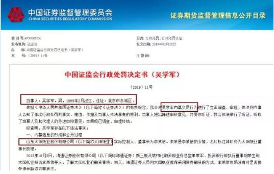 另一位被處罰者吳學(xué)軍控制其本人及“王某萍”“肖某龍”賬戶,在內(nèi)幕信息敏感期內(nèi)買入“太陽紙業(yè)”791.06萬股,賣出5.83萬股,吳學(xué)軍賬戶組盈利1104.19萬元,被證監(jiān)會“沒一罰一”罰沒2208.38萬元。