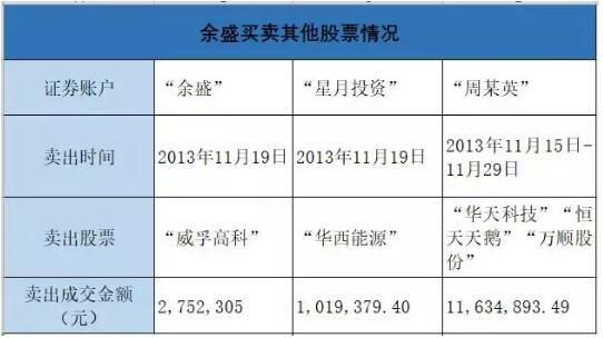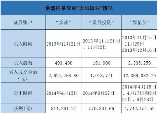 內(nèi)幕信息敏感期為從太陽紙業(yè)董事長李某信認(rèn)可海通證券采用“非公開發(fā)行”方式(不晚于2013年10月31日)至2013年12月4日。 在內(nèi)幕信息敏感期內(nèi),余盛利用自己擔(dān)任法定代表人、總經(jīng)理的星月投資、周某英及其本人賬戶,在內(nèi)“沒一罰一”幕信息敏感期內(nèi)買入“太陽紙業(yè)”295.1359萬股,在內(nèi)幕信息公開后全部賣出,盈利612.67萬元。證監(jiān)會決定“沒一罰一”,共罰沒余盛1225.33萬元。