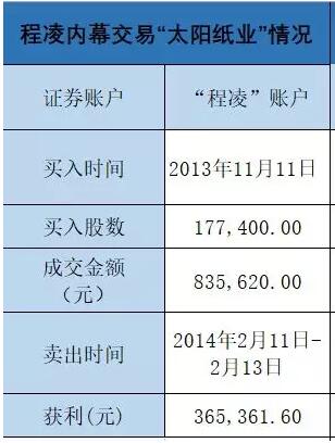 在內(nèi)幕信息敏感期內(nèi),“程凌”賬戶共買入“太陽紙業(yè)”17.74萬股,成交金額83.56萬元,2014年2月11日至2月13日全部賣出,賬戶盈利36.54萬元。據(jù)此,程凌被證監(jiān)會“沒一罰一”共計(jì)罰沒73.07萬元。