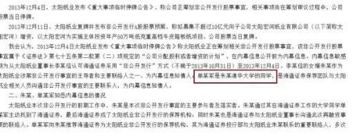 兩位“泄密者”為清華大學(xué)同學(xué) 綜合三張行政處罰決定書來看,三宗內(nèi)幕交易案件涉及兩位作為“泄密”源頭的內(nèi)幕信息知情人。 其一是朱某。根據(jù)行政處罰決定書,太陽紙業(yè)本次非公開發(fā)行的前期工作中,太陽紙業(yè)董事長李某信的女婿、太陽紙業(yè)董事長助理朱某是本次非公開發(fā)行事宜的主要參與者及落實(shí)者。 朱某通過其在海通證券工作的大學(xué)同學(xué)單某軍主動找到了海通證券,最后海通證券成了太陽紙業(yè)非公開發(fā)行的保薦機(jī)構(gòu);同時(shí)朱某也是海通證券與太陽紙業(yè)董事長溝通此次再融資事項(xiàng)的聯(lián)絡(luò)人。 其二則是單某軍。單某軍向朱某推薦海通證券為太陽紙業(yè)非公開發(fā)行的保薦機(jī)構(gòu),他還是海通證券投行部與太陽紙業(yè)的朱某聯(lián)系的重要聯(lián)絡(luò)人。單某軍多次與朱某溝通太陽紙業(yè)再融資事項(xiàng),多次陪同海通證券投行部人員前往太陽紙業(yè)探討保薦事宜,海通證券保薦團(tuán)隊(duì)每次都會及時(shí)將非公開發(fā)行方案的進(jìn)展情況通報(bào)單某軍。 值得一提的是,在針對吳學(xué)軍的罰單中,證監(jiān)會明確表示,單某軍是朱某清華大學(xué)的同學(xué)。
