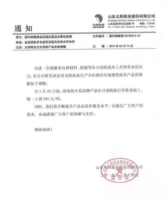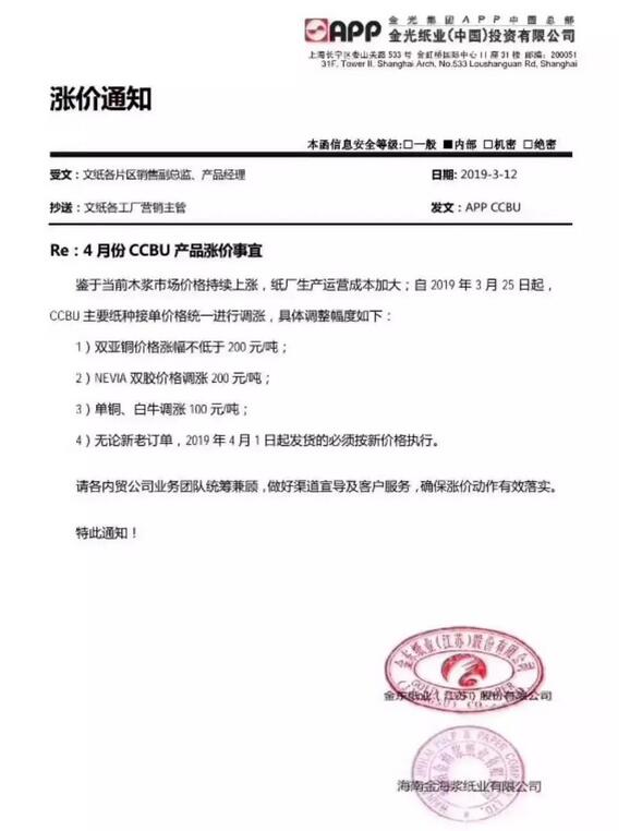APP發(fā)布最新漲價函:鑒于當(dāng)前市場木漿價格持續(xù)上漲,紙廠生產(chǎn)運營成本加大;自2019年3月25日起,CCBU主要紙種接單價統(tǒng)一進行調(diào)漲,具體調(diào)整幅度如下: