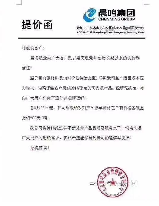 晨鳴紙業(yè):自3月25日起,我司銅版紙系列產(chǎn)品接單價格在目前價格基礎(chǔ)上上調(diào)200元/噸。