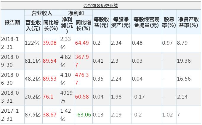導(dǎo)語:合興包裝最新公布的2018年年報(bào)顯示,其營業(yè)收入122億元,同比增長39.08%。更讓人激動的是,去年公司完成對合眾創(chuàng)亞的收購實(shí)現(xiàn)并表,在內(nèi)生與外延雙軌驅(qū)動之下,公司成為紙包裝行業(yè)內(nèi)首家邁入百億營收的企業(yè)。 1、合興包裝2018年凈利潤2.33億元,同比增長64.49% 合興包裝3月15日最新公布的2018年年報(bào)顯示,其營業(yè)收入122億元,同比增長39.08%;歸屬于上市公司股東的凈利潤2.33億元,同比增長64.49%。基本每股收益0.2元。公司最新分配方案為每10股派發(fā)股息人民幣0.50元,股息率0.97%。 近年來,公司的業(yè)績情況如下表所示: