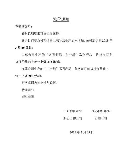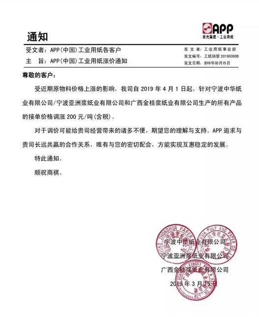 銅版紙 APP:鑒于當前市場木漿價格持續上漲,紙廠生產運營成本加大;自2019年3月25日起,CCBU主要紙種接單價統一進行調漲,具體調整幅度如下: 1)雙亞銅價格漲幅不低于200元/噸; 2)NEVIA雙膠調漲200元/噸; 3)單銅、白牛調漲100元/噸; 4)無論新老訂單,2019年4月1日起發貨的必須按新的價格執行。