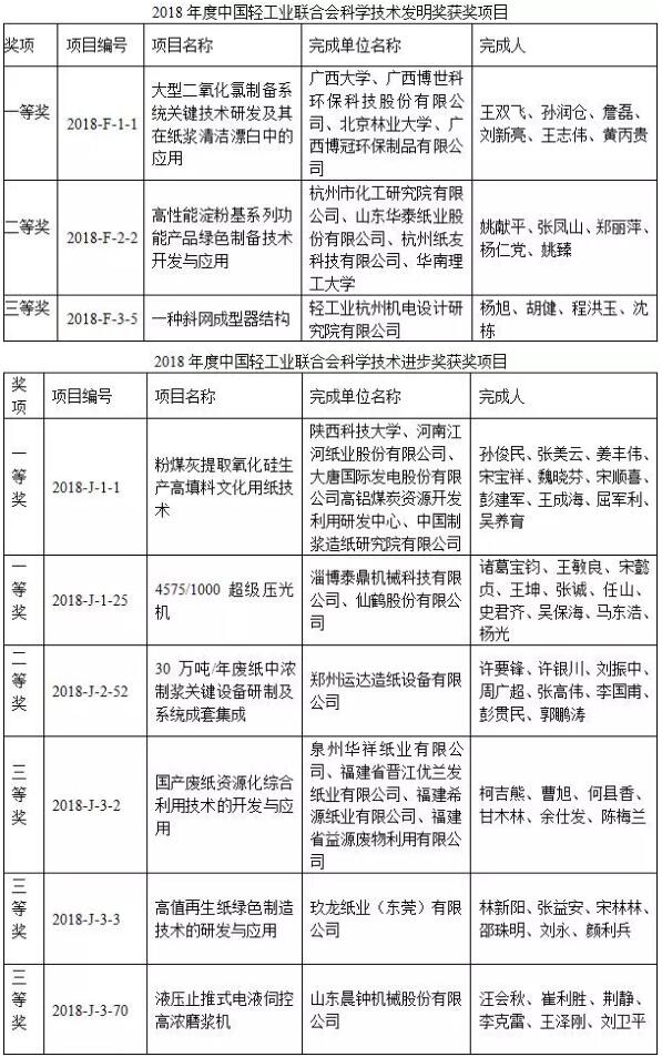 2019年3月25日,中國(guó)輕工業(yè)聯(lián)合會(huì)發(fā)布《關(guān)于2018年度中國(guó)輕工業(yè)聯(lián)合會(huì)科學(xué)技術(shù)獎(jiǎng)勵(lì)的決定》。根據(jù)《中國(guó)輕工業(yè)聯(lián)合會(huì)科學(xué)技術(shù)獎(jiǎng)勵(lì)辦法》的規(guī)定,經(jīng)中國(guó)輕工業(yè)聯(lián)合會(huì)科學(xué)技術(shù)獎(jiǎng)勵(lì)專業(yè)組評(píng)審、中國(guó)輕工業(yè)聯(lián)合會(huì)科學(xué)技術(shù)獎(jiǎng)勵(lì)委員會(huì)審核,中國(guó)輕工業(yè)聯(lián)合會(huì)批準(zhǔn),2018年度中國(guó)輕工業(yè)聯(lián)合會(huì)授獎(jiǎng)項(xiàng)目共182項(xiàng)。其中3項(xiàng)造紙成果榮獲科學(xué)技術(shù)發(fā)明獎(jiǎng),6項(xiàng)造紙成果榮獲科學(xué)技術(shù)進(jìn)步獎(jiǎng)。