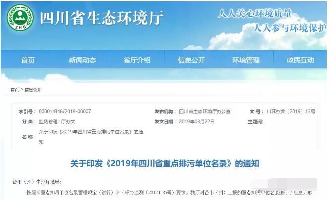 為切實加強重點排污單位環境保護監督管理,3月28日,四川省生態環境廳印發了《2019年四川省重點排污單位名錄》。該名錄以水環境、大氣環境、土壤環境、聲環境為基礎分為四個部分,涉及2438個重點排污點位。