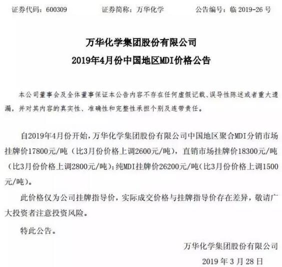 導語:當前,3.21江蘇響水爆炸事故正在發酵,目前化工市場一片恐慌,波動劇烈,漲價潮似乎已經到來,部分產品甚至出現翻倍上漲的行情,像軟包裝用膠粘劑原料聚合MDI價格也已經出現30%的上漲幅度。分析人士預測,后市這一波上漲行情也許會持續到二季度。 據了解,首先是化工巨頭萬華化學最新公告稱:根據化工企業生產工藝特點,為確保生產裝置安全有效運行,按照年度檢修計劃,本公司煙臺工業園 PDH 裝置(75 萬噸/年)將于 2019 年 4 月 1 日開始停車檢修,預計檢修 20 天左右。在此期間,煙臺工業園其他生產裝置正常運轉。 膠粘劑原料MDI價格暴漲! 3月28日,萬華化學4月份聚合MDI價格將再次大幅上調。本次萬華化學中國地區聚合MDI分銷市場掛牌價17800元/噸(比3月份價格上調2600元/噸),直銷市場掛牌價18300元/噸(比3月份價格上調2800元/噸);純MDI掛牌價26200元/噸(比3月份價格上調1500元/噸)。這是自2019年開年以來,萬華化學MDI第三次漲價。