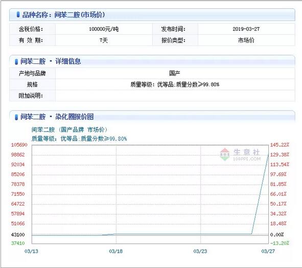 圖表來源:生意社 有關人士指出,爆炸事故發生之前間苯二胺的市場價格位于4.5萬元/噸至5萬元/噸之間。但事故后兩天,市場間苯二胺價格飛漲到8-9萬元/噸。 統計顯示,3月27日國產間苯二胺的報價已達到約10萬元/噸。3月27日,浙江龍盛集團股份有限公司發布公告稱,3月21日下午發生爆炸的江蘇天嘉宜化工有限公司,擁有間苯二胺年產能1萬噸,是行業內僅次于浙江龍盛的第二大核心生產工廠。此次爆炸事件將影響間苯二胺約25%的市場容量,直接導致供應短缺、價格上漲。 國內間苯二胺的主要生產企業包括浙江龍盛、天嘉宜化工和四川紅光化工有限公司(下稱“四川紅光”),其中浙江龍盛產能6.5萬噸,天嘉宜產能1.7萬噸,四川紅光產能未達萬噸。天嘉宜化工爆炸事件之后,四川紅光亦處于停產狀態。目前,浙江龍盛國內間苯二胺唯一的較大供貨商。 苯二胺是重要的染料中間體,主要用作染料中間體,用于制造堿性橙、堿性棕G、直接耐曬黑G等染料,并用作毛皮染料。主要用于芳綸、偶氮染料、硫化染料、酸性染料等。 業內人士分析指出,間苯二胺行業集中難度高。目前國內間苯二胺格局:浙江龍盛6.5萬噸(實際產量在7萬噸左右,自用4萬噸),天嘉宜1萬噸,四川紅光1萬噸。浙江龍盛的市占率在80%左右。浙江龍盛的間苯二胺外售三個方向:染料企業、杜邦(與公司簽訂10年采購合約)、國內生產芳綸1313的企業(一噸芳綸0.5噸間苯二胺)。 間苯二酚價格上升 供需失衡或將傳導致下游間苯二酚及分散染料。間苯二酚是間苯二胺的下游產品,1噸間苯二酚需消耗1.2噸間苯二胺,可應用于紫外線吸收劑,輪胎膠粘劑等領域。 間苯二酚全球僅有兩家生產企業:浙江龍盛(3萬噸)、日本住友(3萬噸)。原英德斯佩克化學公司(美國北方化學旗下)之前也生產,住友收購英德斯佩克化學公司后已將其于17年9月份關閉。預計間苯二胺價格的上漲也會推動間苯二酚價格的上升。 而間苯二胺也是偶氮類分散染料的重要中間體之一,涉及間苯二胺原材料的分散染料占全部分散染料的50%左右,上述涉及的染料中,間苯二胺占全部成本的20-30%,預計間苯二胺的供應緊張或將傳導致分散染料的價格上漲。 液氯價格大幅上行 近幾天,液氯出廠價上調150-300元/噸,出廠價在50-350元/噸左右,市場價上調75-125元/噸,市場價在50-325元/噸。今日漲幅高達197.03%,在漲跌榜中排行NO.1!