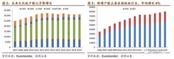 基于2019年新增產(chǎn)能計(jì)劃,從下圖來(lái)看,未來(lái)2年新增產(chǎn)能主要是箱板紙,2017年5000萬(wàn)噸達(dá)到2019年5600萬(wàn)噸左右,過(guò)去3年箱板紙行業(yè)需求增長(zhǎng)一般維持在2~3%左右,其中最大的推動(dòng)因素是快遞行業(yè)。我們認(rèn)為,造紙行業(yè)整體供需格局依然穩(wěn)健,供應(yīng)壓力主要體現(xiàn)在包裝紙行業(yè)上,而文化紙行業(yè)新增產(chǎn)能幾乎為零,如果假設(shè)未來(lái)紙品需求依然穩(wěn)健,未來(lái)造紙行業(yè)供需壓力無(wú)須過(guò)于擔(dān)心。