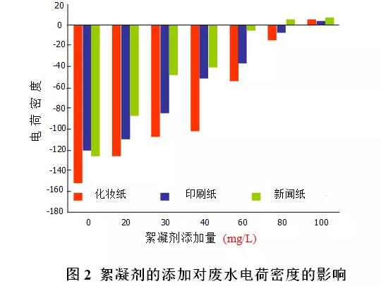 CST測定裝置示于圖1。滴入6ml濾液到內徑1.5cm的管內,測定其濾液從第一感應器到第二感應器所經過的時間。 4、絮聚物強度測定 以前一般都以絮聚物的大小作為絮聚性能的評價標準,但離子性不強的有機高分子絮凝劑也能形成巨大絮聚物,因此最重要的評價標準應該是絮聚物的強度。 根據以前報告的結論,先把廢水pH值調整為6.5~7.5,將懸濁液先進行300r/min,10 min的急速攪拌之后,再繼續(xù)進行50r/min,15min的緩慢攪拌絮聚處理,之后測定一次濁度RT(O),之后對絮聚物進行500r/min、30s破壞打碎,沉淀30min后,再測定上澄液的濁度RT(B)。比較破壞前后濁度,破壞前后的差值越小,說明絮聚物強度良好,越大則說明不良。 5、絮凝劑添加量對電荷密度的影響 絮凝劑添加量對電荷密度的影響示于圖2。首先,沒有添加絮凝劑之前其電荷密度都顯示為負,其中化妝紙廢水的負的電荷密度最大。當添加C-APM之后,廢水的電荷密度都從負電荷向正電荷變化,這是因為廢水原先帶有陰離子,添加陽離子絮凝劑使其轉變?yōu)榱苏姾伞?/p>