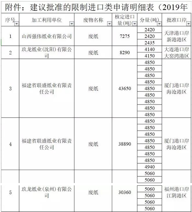 4月23日,2019年第六批廢紙進口許可名單公示,5家紙廠獲準進口,總核定進口量為22.48萬噸。其中,聯盛紙業(龍海)有限公司獲批額度最多,約9.63萬噸;其次為福建省聯盛紙業有限責任公司,核定進口量約8.25萬噸。