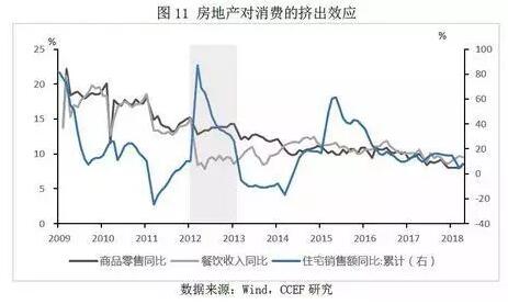 房地產對居民消費擠出效應明顯 總體而言,從2009年至2018年,我國居民的購房直接減少居民的可支配收入,在沒有股市財富效應等其他財產性收入增長的前提下,通常會導致當期居民消費支出受到擠壓。以2013年為例,房地產銷量上升后餐飲收入同比增速迅速平均下降約4.5個百分點,而同期商品零售同比增速下降0.7個百分點。