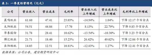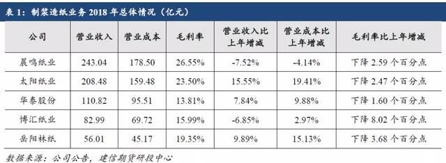 摘要:2018年以來,紙漿下游需求持續低迷,而今年以來,春季的文化紙旺季也表現平淡,近期多家規模紙廠受成本端壓力發布漲價函。 文化紙行業作為產業集中度較高的行業,本文從文化紙企業入手分析文化紙行業經營情況。本文以晨鳴紙業、太陽紙業、華泰股份、博匯紙業和岳陽林紙五家上市公司為例,將各家2018年報和2019年一季度報進行匯總梳理。 根據五家2018年報發布的數據計算,文化紙成本構成中原材料端約占80.7%。 2018年產品庫存較上年增長顯著,銷售量則有所下滑。 2018年及2019年一季度毛利率均同比下滑,也側面印證了去年以來造紙原材料成本端面臨壓力,下游需求表現較差。 對于二季度,目前已經過去一個月,四月份整體需求不佳,雖然規模紙廠發布漲價函,但需求并沒有改善,文化紙或提前進入淡季。 一、基本情況介紹 2018年以來,紙漿下游需求持續低迷,而今年以來,春季的文化紙旺季也表現平淡,近期多家規模紙廠受成本端壓力發布漲價函。文化紙行業作為產業集中度較高的行業,本文從文化紙企業入手分析文化紙行業經營情況。本文以晨鳴紙業、太陽紙業、華泰股份、博匯紙業和岳陽林紙五家上市公司為例,將各家2018年報和2019年一季度報進行匯總梳理。由于這五家主營產品和統計口徑有所不同,本文分析側重木漿系文化紙。 二、制漿造紙業務2018年總體情況 這部分選取五家在制漿造紙業務的經營數據,對比五家營業收入和成本。毛利率方面,從五家制漿造紙業務總體情況來看,毛利率均較上年減少1~8個百分點,主要受原材料端成本的影響。營業成本方面,除晨鳴外,其余四家營業成本較上年均有增長。