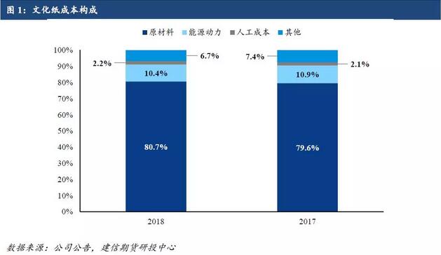 四、文化紙成本構成 根據五家2018年報發布的數據計算,文化紙成本構成中原材料端約占80.7%,比2017年的79.6%比例小幅增長;其他各項,能源動力占10.4%,人工成本占2.2%,其他制造費用6.7%。