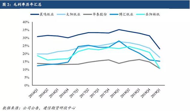 五、2019年一季度整體經營情況及展望 從五家一季度數據顯示,毛利率均較上年減少,平均毛利率減少10個百分點。而從分季度毛利率匯總情況我們可以看出,去年以來毛利率呈下滑趨勢,紙制品下游需求不樂觀,加之造紙原材料成本端壓力,擠壓了紙企利潤。 對于二季度,目前已經過去一個月,四月份整體需求不佳,雖然規模紙廠發布漲價函,但需求并沒有改善,文化紙或提前進入淡季。