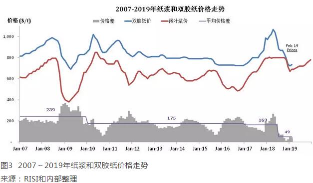 國產(chǎn)木漿供應(yīng)量減少 4月國產(chǎn)闊葉漿廠計(jì)劃于檢修,預(yù)計(jì)減少闊葉漿排產(chǎn)17萬噸。 — APP計(jì)劃4月5日到4月16日停機(jī)檢修12天,預(yù)計(jì)減產(chǎn)6.5萬噸; — 亞太森博因5月份停機(jī)水洗及轉(zhuǎn)產(chǎn)溶解漿減少闊葉漿供應(yīng)約8萬噸; — 王子計(jì)劃5月份停機(jī)2周,預(yù)計(jì)減產(chǎn)2.5萬噸。 漿廠供應(yīng)的減少進(jìn)一步給漿價(jià)做了支撐。 2019年紙漿會(huì)穩(wěn)中偏緊,紙價(jià)與漿價(jià)長期保持合理價(jià)格差,預(yù)計(jì)紙價(jià)會(huì)進(jìn)一步上漲,修復(fù)到合理水平。如圖3。