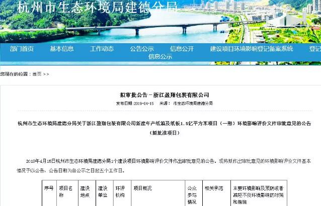 導語:近期,浙江省杭州市生態環境局建德分局發布環評審批意見公告,擬批準浙江盈翔包裝年產1.5億紙板紙箱項目實施。