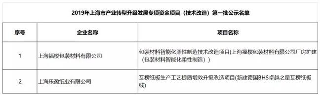 導(dǎo)語(yǔ):5月28日,上海市經(jīng)信局發(fā)布2019年上海市產(chǎn)業(yè)轉(zhuǎn)型升級(jí)發(fā)展專(zhuān)項(xiàng)資金項(xiàng)目,上海福櫻包裝材料有限公司和上海樂(lè)盈紙業(yè)有限公司的相關(guān)項(xiàng)目入圍。