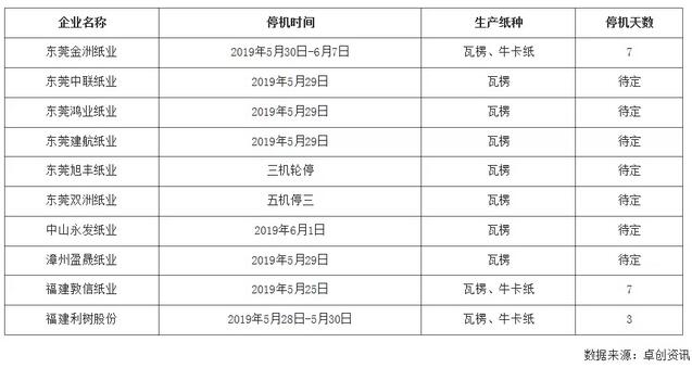 紙廠5月底、6月初相繼停機(jī)檢修,目的是什么? 本輪調(diào)降之前,華南地區(qū)紙廠均對(duì)紙市后期走勢(shì)存悲觀預(yù)期,其中廣東部分中小型紙廠已在龍頭紙企調(diào)降之前調(diào)整5-7次,累計(jì)降價(jià)200-300元/噸。而龍頭紙企的這次大幅度調(diào)價(jià)成為壓垮紙廠開(kāi)機(jī)信心的最后一根稻草。調(diào)價(jià)當(dāng)日華南地區(qū)部分紙企相繼發(fā)布停機(jī)檢修通知。 表1 華南地區(qū)部分紙企停機(jī)檢修匯總表