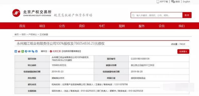 日前,岳陽林紙股份有限公司在北京產權交易所以掛牌方式轉讓子公司永州湘江紙業有限責任公司100%股權及786,054,836.23元債權。
