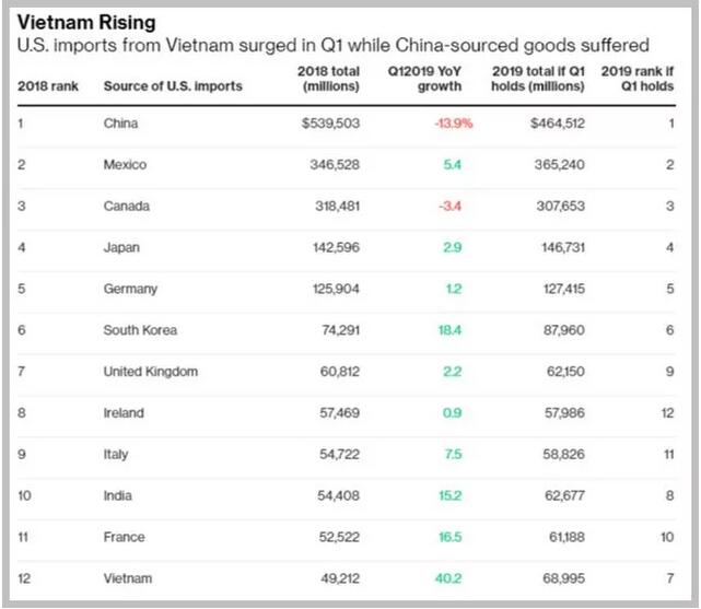 在貿(mào)易戰(zhàn)背景下,今年第一季度中國對美出口下降13.9%;上月包括日本、韓國、新加坡和臺灣等區(qū)域主要經(jīng)濟(jì)體對美出口也都出現(xiàn)下滑,而越南上月對美出口同比增長7.5%。 彭博社分析指出,受美國對中國加征關(guān)稅影響,許多企業(yè)紛紛將供應(yīng)鏈轉(zhuǎn)移到越南,越南本身也具備勞動力成本低、營商氣氛不斷改善的優(yōu)勢,這些都成為促進(jìn)越南經(jīng)濟(jì)增長的積極因素。
