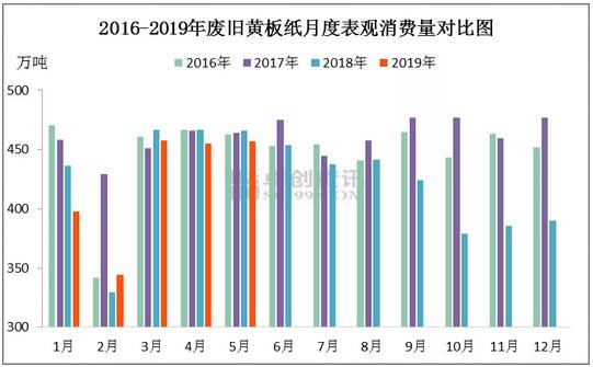 實(shí)際上,自步入2019年以來,紙價(jià)和廢紙價(jià)格就失去了昔日高高在上的姿態(tài),“炒房不如炒紙”的言論也逐漸消散,無論是上市紙廠還是中小紙廠,無論是紙企上游的打包站還是下游的包裝企業(yè),都面臨著需求寡淡、訂單下滑的窘境。 以廢紙價(jià)格為例。2019年1-5月份,廢紙價(jià)格先揚(yáng)后抑,從2500元/噸以上的價(jià)位跌落至2000元/噸上下,其中的原因主要是受需求壓力所致。 一方面,廢紙消費(fèi)量同比下降。2016年以來,對比春節(jié)后3月-5月廢紙?jiān)露缺碛^消費(fèi)量來看,2019年數(shù)據(jù)有明顯下滑。據(jù)卓創(chuàng)資訊統(tǒng)計(jì)數(shù)據(jù)顯示,2019年3-5月,廢紙總消費(fèi)量同比下降2.10%。