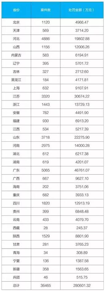 1月~4月,行政處罰案件數量排名前五的省份為:廣東、河北、山東、江蘇、河南;行政處罰罰款金額排名前五的省份為:廣東、江蘇、山東、河北、河南。