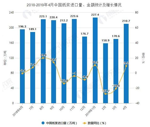 據數據顯示,2018年1-4季度中國紙漿進口量波動幅度較小,波動幅度不超5%。2019年4月中國紙漿進口量為210.7萬噸,同比增長9.2%。2019年1-4月中國紙漿進口量達到768萬噸,同比下降6%。