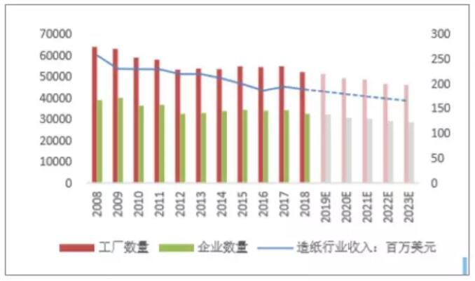 數據來源:公開資料整理 (2)文化用紙增長乏力,可替代性較強 美國學齡兒童數量經過上世紀末的快速增長,進入21世紀之后維持基本穩定,增長率幾乎為0。此外,根據美國人口普查局的預測數據,美國未來的人口粗出生率還將不斷下降。新生兒的減少,將會直接導致學齡兒童數量的減少,因此預期由教學引致的文化用紙需求將會有所下降。 對文化用紙需求產生影響的另一因素是電子傳媒產品。據統計,電子書在2013年之前經過井噴式增長之后,增長速度逐漸轉負,紙質書市場略有回暖。究其原因,是因為在2014年,美國主要的電子書銷售平臺與亞馬遜就電子書達成代理協議、電子書重新實行代銷制,售價抬高,嚇退消費者。盡管美國目前電子書銷售出現了下滑,陷入發展的瓶頸期,但是電子書相較于紙質書,具有便捷、環保的特點,同時互聯網的普及使盜版電子書的獲取、流通成本幾乎為零,因此預期在電子書的發展趨于規范之后,電子書有望進一步擴大其在圖書市場的份額。 (3)生活用紙需求穩定,可替代性極低 近幾年來,美國生活用紙銷售規模以1%~2%的速度穩步增長,與美國人均可支配收入基本保持同步增長,二者的增長趨勢比較一致。考慮到生活用紙的必選消費屬性,美國生活用紙被替代的可能性極低,但與此同時,結合美國經濟平穩增長的趨勢,生活用紙市場規模也不太可能出現大幅的擴張。 3、產業鏈:上游原材料供給充足,下游需求平穩增長 行業的議價能力可以從產業鏈的角度進行分析。造紙行業的上游行業是制漿、林木行業等,而下游則對接包裝、印刷等行業以及終端消費。造紙行業對上游的議價能力,可以從上游行業的企業數量、原材料的供給量以及造紙企業是否有向上游拓展業務來衡量。 具體來說,當上游呈現出下面的特點時,則造紙行業與上游的議價能力就越強: ①上游企業數量越多,造紙行業與上游的議價能力就越強; ②原材料供給越多,造紙行業與上游的議價能力就越強; ③造紙行業向上游拓展其業務,造紙行業與上游的議價能力就越強。 造紙行業對下游的議價能力可以從下游行業的企業數量、下游行業對造紙行業產品的需求量以及產品同質化程度等指標來衡量。 具體來說,當下游呈現出下面的特點時,則造紙行業與下游的議價能力就越強: ①下游企業數量越多,或需求越分散,造紙行業與下游的議價能力就越強; ②下游對紙制品的需求越旺盛,造紙行業與下游的議價能力就越強; ③造紙行業的產品同質化程度越低,造紙行業與下游的議價能力就越強。 美國造紙行業經過環保立法的去產能以及行業自身的兼并,目前僅有140余家造紙企業,CR10近年來維持在90%以上。造紙行業企業數量少,行業集中度很高,導致美國造紙行業在產業鏈上下游的議價能力相對較強。除此之外,美國造紙行業的原材料供給也十分充裕。 紙漿方面,2017年,全球紙漿總產量為18576.3萬噸,而其中美國的紙漿產量就達到了4835.1萬噸,占全球紙漿總產量的26.03%,紙漿出口量達到715.1萬噸,占全球紙漿總出口量的12.13%。美國在廢紙方面的優勢同樣明顯,2017年全球廢紙總出口量達到5699萬噸,而美國是全球最大的廢紙出口國,出口廢紙達到1828.9萬噸,占全球廢紙出口量的比重達到32.09%。 美國的廢紙回收率也非常高,近年來,美國廢紙回收率維持在70%上下,廢紙供給較為充足。可見,美國造紙行所需的原材料——紙漿及廢紙的供應都比較充裕。此外,美國造紙行業的龍頭公司如國際紙業等,大多擁有公司自有林地,或通過收購兼并等,拓展自己的上游制漿業務,逐步完善產業鏈布局,對上游的依賴程度較低,因此美國造紙行業與上游的議價能力也相對較強。 美國造紙行業下游議價能力方面,可以分紙種進行分析。 包裝用紙方面,美國的紙包裝行業已經發展的十分成熟,紙包裝市場規模已經能達到包裝市場總規模的50%以上,下游包裝行業對包裝用紙的需求較為旺盛。此外,美國造紙行業的龍頭企業,如國際紙業、WestRock、PackagingCropofAmerica等,都在自身的造紙業務之外,都有向下游拓展其包裝業務,而且紙包裝業務甚至已經成為個別公司的主要業務。行業向下游的業務拓展,在完善了自己的產業鏈之余,也解決了行業下游的產品議價問題。 生活用紙方面,從下游的需求方來看,生活用紙直接面向消費者,因此購買方相對分散,生活用紙制造商相對更有市場勢力,議價能力相對更強。目前美國人均生活用紙消費量已經達到20千克/年以上,在全球范圍內屬于領先水平。而且隨著美國經濟的進一步發展,人民生活水平的提升,生活用紙的需求會被進一步情境化,將會更多異質性的生活用紙需求產品涌現出來,以滿足消費者不同的細分生活用紙需求。結合生活用紙的剛性需求,下游消費者對生活用紙的需求會保持穩定增長,生活用紙生產商的下游議價能力相對強勢。 文化用紙則有所不同,隨著電子傳媒等新興閱讀方式的興起,紙質書的需求會逐步降低。作為一個需求導向型的行業,需求的低迷將會迫使造紙企業降低產品價格。換言之,造紙企業的議價能力較低。此外,和生活用紙、特種紙相比,文化用紙的產品異質性更弱,產品之間的同質性特點更為明顯。換言之,不同造紙企業的產品之間的替代性較強,行業議價能力也會因此而受到削弱。 綜合上述對美國造紙行業市場競爭格局及上下游的分析,美國造紙行業經過多年的發展,目前