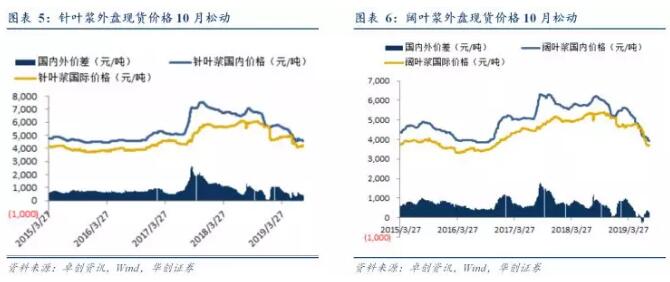 截至8月9日,針葉漿外盤平均價格為609美元/噸,折合人民幣4270元,環比上漲0.62%,同比下跌29.7%;內盤平均價格為4575元/噸,環比下跌2.22%,同比下跌13.9%;國內外價差縮減到305.5元/噸,環比下降40.5%,同比下降59.9%。 截至8月9日,闊葉漿外盤平均價格為531美元/噸,折合人民幣3727元,環比下跌8.4%,同比下跌32%;;內盤平均價格為3936元/噸,環比下跌5.5%,同比下跌34.6%;自7月5日起,闊葉漿恢復國內價格高于國際價格,國內外價差呈現出先擴大后縮小的態勢,7月25日達到最高的371.7元/噸。 18年8月以來內盤漿價調整明顯,先于外盤漿價下跌,去年10月以來隨著國內貿易商庫存高企,海外企業庫存總體保持穩定,受國內貿易商港口庫存高企的影響,采購熱情趨淡,外盤漿價開始松動,我們認為本輪外盤現貨下跌的標志性指標是國內港口貿易商的庫存去化情況。