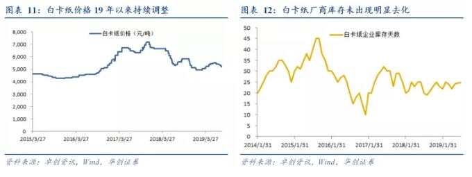 18年9月以來白卡紙價格持續調整,今年以來白卡紙成為調整最多的紙種,截至2019年7月,白卡紙企業庫存天數24.8天,較6月略有上升;企業庫存為52.2萬噸,環比回升0.9萬噸;白卡紙廠商庫存未出現明顯去化,需求仍處于相對疲弱狀態。