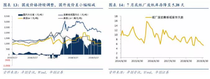 (三)7月國廢價格呈現緩慢下跌走勢,紙廠黃板紙庫存中樞下行 截至8月9日,國內廢黃板紙價格為2051.3元/噸,同比下跌29.1%,環比下跌4.2%,7月國廢價格呈現緩慢下跌走勢;國內外廢紙差縮小到1192.1元/噸,環比下降12.8%,同比下降15.8%。18年9月下游需求疲弱以來,廠商去化庫存中樞下行,至19年7月底廠商黃板紙庫存達到5.38天,環比下降0.37天。