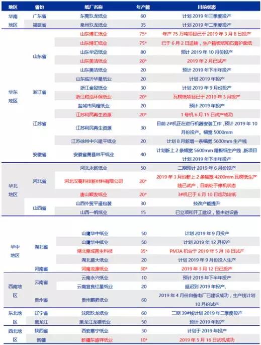 目前箱板瓦楞紙行業(yè)集中度較低,一方面龍頭紙企紛紛擴(kuò)建產(chǎn)能,旨在快速提升市占率,全國布點(diǎn)擠出區(qū)域性中小產(chǎn)能,另一方面漿紙系紙企希望,把握箱板瓦楞紙需求增長機(jī)遇,紛紛投建箱板瓦楞紙項(xiàng)目。 數(shù)據(jù)顯示,2018年玖龍、理文、山鷹前三大紙企合計(jì)產(chǎn)能 2109 萬噸,占全行業(yè)產(chǎn)能 6722 萬噸的31%。因此短期內(nèi)新增產(chǎn)能的密集投放,對(duì)于行業(yè)供需格局形成一定壓力。 2019 年箱板瓦楞紙行業(yè)在建產(chǎn)能情況
