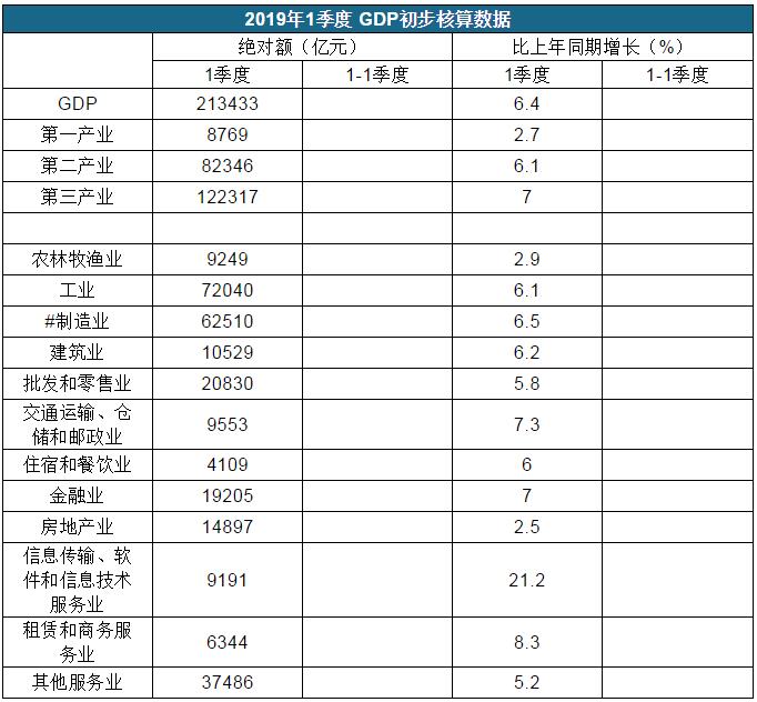 (數(shù)據(jù)來源:國家統(tǒng)計(jì)局) 2019年1季度 GDP初步核算數(shù)據(jù)