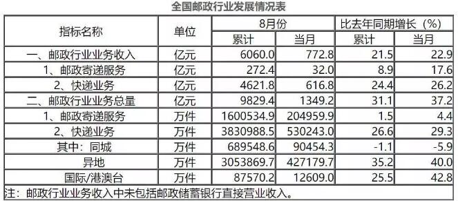 日前,國(guó)家郵政局發(fā)布行業(yè)最新數(shù)據(jù)。1-8月份,郵政行業(yè)業(yè)務(wù)收入(不包括郵政儲(chǔ)蓄銀行直接營(yíng)業(yè)收入)累計(jì)完成6060億元,同比增長(zhǎng)21.5%;業(yè)務(wù)總量累計(jì)完成9829.4億元,同比增長(zhǎng)31.1%。 8月份,全行業(yè)業(yè)務(wù)收入完成772.8億元,同比增長(zhǎng)22.9%;業(yè)務(wù)總量完成1349.2億元,同比增長(zhǎng)37.2%。
