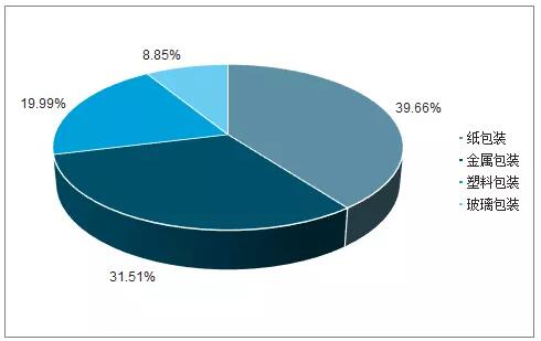 2018-2023年包裝行業(yè)銷售收入及預(yù)測(cè) 中國(guó)包裝市場(chǎng)合計(jì)營(yíng)收9433.74億元,紙和紙板制造占比39.66% 目前,中國(guó)市場(chǎng)上應(yīng)用最廣泛的是紙質(zhì)包裝和塑料包裝產(chǎn)品,其次是金屬包裝和玻璃包裝。 據(jù)調(diào)查數(shù)據(jù)統(tǒng)計(jì)顯示,紙包裝、塑料包裝、金屬包裝和玻璃包裝合計(jì)實(shí)現(xiàn)營(yíng)業(yè)收入9433.74億元,紙和紙板制造占整個(gè)包裝主營(yíng)業(yè)務(wù)收入的39.66%。 中國(guó)包裝行業(yè)細(xì)分市場(chǎng)營(yíng)銷占比