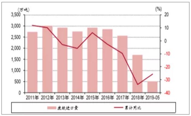 數據來源:公開資料整理 二、廢紙價格走勢分析 2018年進口廢紙1703萬噸,全年相較17年減少870萬噸。17年全年消耗廢紙漿6300萬噸,18年廢紙進口的減少相當于減少了724萬噸廢紙漿,占總需求的11.5%,但是由于需求的下降,箱板瓦楞紙產量下降10%,基本抵充了廢紙原材料的減少,預期中的原材料短缺情況并未出現,使得旺季紙價和廢紙價格走勢不達預期。 我國紙漿產品進口依存度從2008年的12.93%飆升至2018年的23.39%,其中廢紙漿進口依存度更是超過50%。廢紙漿是廢紙在回收后經過分類篩選、溫水浸漲,被重新打成紙漿以期再次利用的紙漿。它是我國造紙的重要原材料。如今,在限制外廢進口的形勢下,廢紙進口量不斷減少,廢紙漿的進口量也 在不斷加大,有的大型紙企甚至在海外投資建設再生漿線,把廢紙加工成廢紙漿再進口到國內。 紙漿進口一度低迷這一慘淡景象在2019年迎來好轉。2019年1-2季度中國紙漿進口量逐漸增長,增長了 26.04%。2019年3月底我國共進口廢紙漿8.28萬噸,較去年同期增長395.81%。2019年7月中國紙漿進口量為258萬噸,同比增長36.4%;進口金額為1653百萬美元,同比增長7.6%。而根據國務院文件,政府將力爭于2020年年底實現固體廢物零進口,這勢必會大大增加廢紙漿的進口需求。 廢紙價格受到需求不振和進口原料管控的雙重影響,波動較紙價明顯更大,上半年整體呈震蕩下行趨勢。19年前8批額度已經下發837萬噸,根據2020年底禁止進口的時間表,今年是禁止進口的倒數第二年,下半年下發的額度預計將非常有限。前5月廢紙進口502萬噸,相對于去年減少了96萬噸,減少尚不明顯。如果下半年下放的節奏明顯放緩,進口量將明顯減少。國內廢紙回收量提升空間有限,假設貿易戰緩和,出口需求恢復情況下,廢紙供需在Q3后期需求旺季到來時將有望偏緊。廢紙價格有望走強。 美廢價格走勢