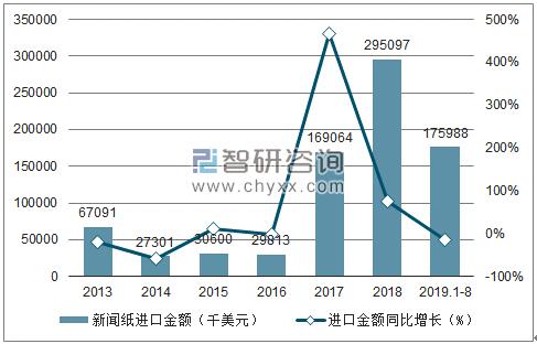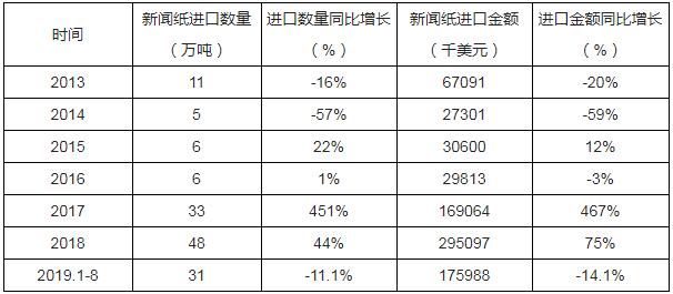 2013-2019年8月中國新聞紙進口數(shù)量及進口金額統(tǒng)計表