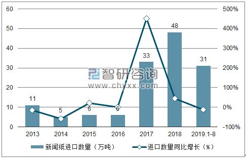 2013-2019年8月中國新聞紙進口數(shù)量趨勢圖