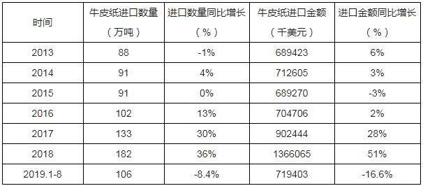 2013-2019年8月中國牛皮紙進口數量及進口金額統計表