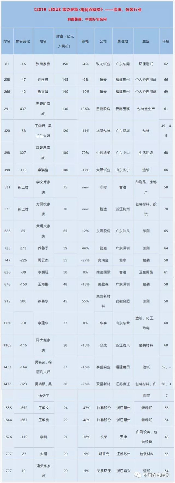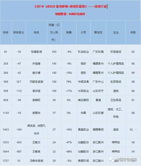 張茵家族依舊是造紙業(yè)首富 與包裝印刷行業(yè)密切相關(guān)的造紙業(yè)中,共有11人(家族)上榜。玖龍紙業(yè)的張茵家族依舊排名造紙業(yè)第一,財富達350億元,位列百富榜第81位。緊隨其后的是為來自恒安的許連捷和施文博,在造紙業(yè)分別排名第二和第三,在百富榜中分別位列第145位和第140位。 財富達到百億元以上的除了以上三位,還有來自中順潔柔的鄧穎忠家族與來自太陽紙業(yè)的李洪信。值得一提的是,鄧穎忠家族與李洪信的財富大致相等,均為一百億元,年齡也相差無幾,分別是68歲和66歲。 在排名變化方面,鄧穎忠家族上升最快,在百富榜中上升了327位,其次為來自榮晟環(huán)保的馮榮華家族,在百富榜中上升了10位。其余人(家族)在百富榜中的排名,相比去年均有所下降,其中來自仙鶴股份的王敏文和王敏良更是分別降低了653位和667位。 在本次的榜單中,除了張茵家族、馮榮華家族,幾乎就很難再找到來自包裝紙行業(yè)的企業(yè)家。上榜最多的是生活用紙行業(yè)的企業(yè)家,如來自恒安的許連捷和施文博,來自中順潔柔的鄧穎忠家族,來自維達國際的李朝旺。