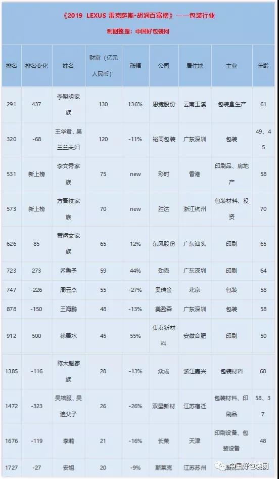 包裝印刷行業(yè)共有13人(家族)上榜 在包裝印刷行業(yè),共有13人(家族)上榜。其中,來自恩捷股份的李曉明家族,來自裕同科技的王華君、吳蘭蘭夫婦,財富均在百億人民幣以上,占據(jù)業(yè)內(nèi)財富榜單的前兩名,在百富榜中分別排名第291位和320位。 而業(yè)內(nèi)排行第三的是來自彩時的李文秀家族,這是今年新上榜的家族,財富為75億元,在百富榜中排名第531位。同樣新上榜的方吾校家族在業(yè)內(nèi)排行第四,來自勝達集團,財富為70億元,在百富榜中排名第573位。 在排名變化方面,集友新材料的徐善水上升幅度最大,在百富榜中上升了500位;其次為李曉明家族,在百富榜中上升了437位。而來自勁嘉股份的喬魯予則上升了273位,以59億元的財富在業(yè)內(nèi)榜單中排名第六。 具體在包裝印刷行業(yè)的各領(lǐng)域中,紙包裝、軟包裝、金屬包裝領(lǐng)域均有人(家族)上榜。而在紙包裝領(lǐng)域,裕同科技的王華君、吳蘭蘭夫婦,勝達集團的方吾校家族,美盈森的王海鵬在榜單之中。如果再算上以煙包為主的恩捷股份、東風(fēng)股份和勁嘉股份,那么百富榜中共有6家紙包裝企業(yè)的企業(yè)家上榜。
