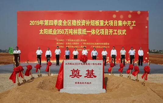 2019年10月16日,這是一個值得銘記的日子,是一個注定載入太陽紙業發展史冊的日子——太陽紙業廣西北海年產350萬噸林漿紙一體化項目隆重舉行開工儀式!這是太陽紙業不斷追求可持續高質量發展的又一次歷史性跨越;這是全體太陽人努力打造可持續發展、受人尊重的全球卓越企業的重要階段性成果;這更是太陽紙業再次騰飛的一個嶄新開始!