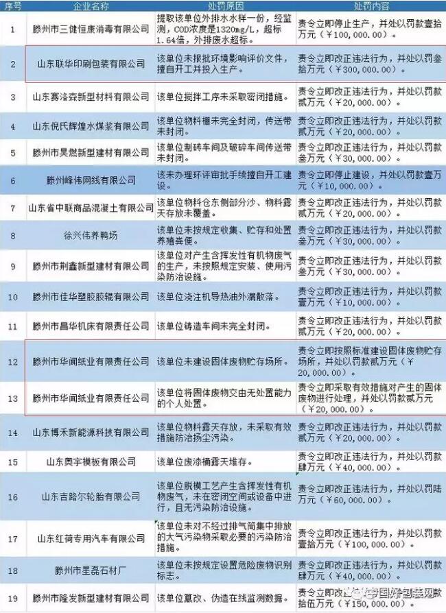 此外,還有一家印刷企業(yè)--山東聯(lián)華印刷包裝有限公司也被開了罰單。該企業(yè)因未報批環(huán)境影響評價文件,擅自開工并投入生產(chǎn),被責令立即改正違法行為,并處以罰金30萬元。