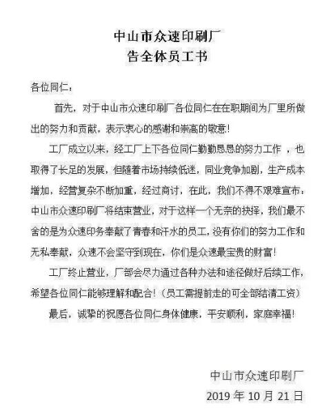 中山市眾速印刷廠告全體員工書 各位同仁: 首先,對于中山市眾速印刷廠各位同仁在在職期間為廠里所做出的努力和貢獻,表示衷心的感謝和崇高的敬意! 工廠成立以來,經工廠上下各位同仁勤勤懇懇的努力工作,也取得了長足的發展,但隨著市場持續低迷,同業競爭加劇,生產成本增加,經營復雜不斷加重,經過商討,在此,我們不得不艱難宣布:中山市眾速印刷廣將結束營業,對于這樣一一個無奈的抉擇,我們最不舍的是為眾速印務奉獻了青春和汗水的員工,沒有你們的努力工作和無私奉獻,眾速不會堅守到現在,你們是眾速最寶貴的財富! 工廠終止營業,廠部會盡力通過各種辦法和途徑做好后續工作,希望各位同仁能夠理解和配合! (員工需提前走的可全部結清工資) 最后,誠摯的祝愿各位同仁身體健康,平安順利,家庭幸福! 中山市眾速印刷廠 2019年10月21日 這兩份通知與其他關停通知并無異處,均說明結業原因以及員工后續補償問題。藝嘉印刷公開的通知言簡意賅,“因經營發生嚴重困難無以為繼”寥寥幾字便說明了公司倒閉的原因,眾速印刷則簡短地陳述了在公司當前經營狀況下------“市場持續低迷,同業競爭加劇,生產成本增加,經營復雜不斷加重”,無奈終止營業。只不過相對于藝嘉印刷的官方措辭,眾速印刷的通知言語間還流淌著一股溫情。 小編從網上公開資料獲悉,東莞藝嘉成立于1994年,系由塘廈經濟發展總公司與香港藝強包裝印刷有限公司合資的印刷企業,是一家占地42000平米的大型印刷包裝企業。 在此次通知發布不久之前,此公司就結業遣散員工事宜曾與員工發生矛盾。8月30日,藝嘉印刷廠上演了一場員工集體跳樓秀,起因則是公司遣散部分員工時對賠償金不滿而引發。據說大老板同意賠百分之九十,但是最后股東會上只同意賠百分之四十,員工們覺得賠太少了,就一起上六樓頂欲以跳樓威脅。 如今看來,藝嘉印刷早已陷入了經營困境,只是在等待著最后一根稻草而已。 而眾速印刷是一家創立于2016年的小微型企業,主要從事印刷品印刷。迄今為止成立不過短短3年,當下面臨關廠的境遇,想必其中的悲痛心酸只有老板才明了吧。 近幾年,隨著開廠成本壓力持續增大,稅收、廠租、環保設備及人工不斷上漲,客戶將產能逐漸向外轉移以及環保高壓政策之下,國內許多印刷包裝廠都熬不下去了,最終只能以破產倒閉的悲慘結局收尾。 不敵市場競爭環境下的大浪淘沙,許多企業無奈倒下。祝愿那些還在咬牙堅持的企業迎來屬于自己的曙光。
