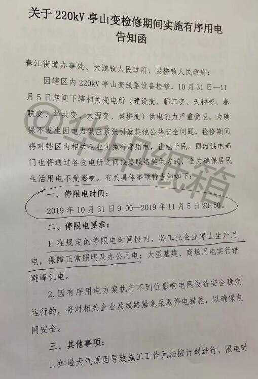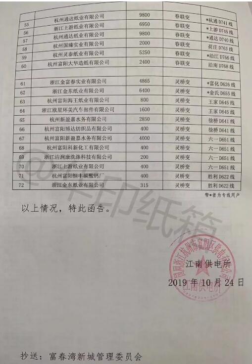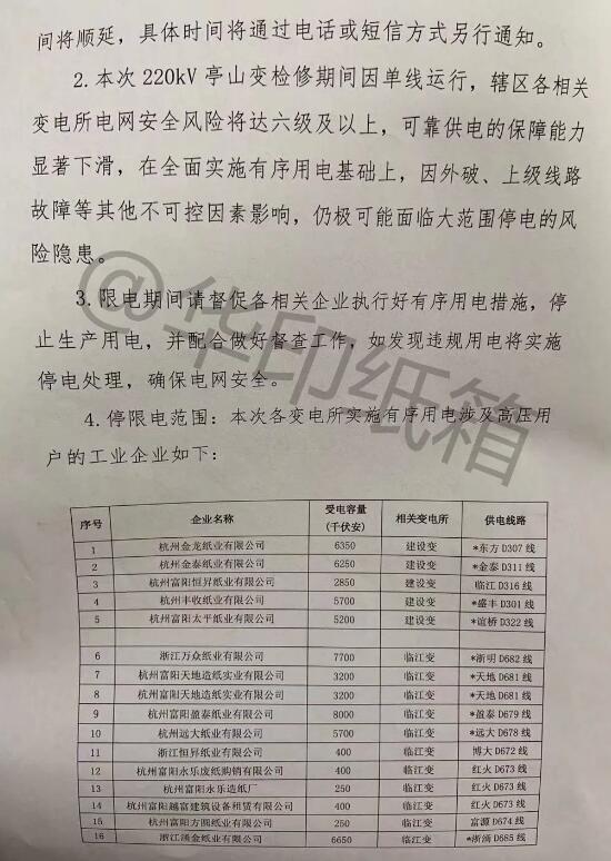 導(dǎo)語(yǔ):因供電設(shè)備進(jìn)行大檢修,浙江富陽(yáng)35家造紙廠再次被迫停限產(chǎn),時(shí)間將近1周。此外,據(jù)卓創(chuàng)造紙調(diào)研,今年浙江省繼續(xù)推進(jìn)造紙改造升級(jí),年初已關(guān)停白板紙產(chǎn)能達(dá)100多萬(wàn)噸,2020年春節(jié)前將繼續(xù)關(guān)停100多萬(wàn)噸,預(yù)計(jì)2019年中國(guó)白板紙產(chǎn)量將近900萬(wàn)噸。2020年浙江省將繼續(xù)關(guān)停150萬(wàn)噸白板紙產(chǎn)能,預(yù)計(jì)2020年白板紙產(chǎn)量800萬(wàn)噸左右。這意味著,2020年浙江還有250萬(wàn)噸白板紙產(chǎn)能將被清退!一場(chǎng)行業(yè)洗牌已經(jīng)來(lái)臨! 供電設(shè)備檢修,富陽(yáng)35家造紙廠被迫停限產(chǎn)近一周 近日,浙江省富陽(yáng)區(qū)春江街道、大源鎮(zhèn)、靈橋鎮(zhèn)的造紙企業(yè)又被無(wú)奈停限產(chǎn)了!根據(jù)官方文件通知,原因是:因轄區(qū)內(nèi)220KV亭山變線路設(shè)備檢修,10月31日-11月5日期間下轄相關(guān)變電所供電能力嚴(yán)重受限,為確保不發(fā)生因電力供應(yīng)緊張引發(fā)其他公共安全問(wèn)題,檢修期間將對(duì)轄區(qū)內(nèi)相關(guān)企業(yè)實(shí)施有序用電,讓電于民。 一、停限電時(shí)間:2019年10月31日9:00-11月5日23:50 二、停限電要求: 1、在規(guī)定的停限電時(shí)間內(nèi),各工業(yè)企業(yè)停止生產(chǎn)用電,保障正常照明及辦公用電。 2、因有序用電方案執(zhí)行不到位影響電網(wǎng)設(shè)備安全穩(wěn)定運(yùn)行的,將對(duì)相關(guān)企業(yè)及線路緊急采取停電措施。