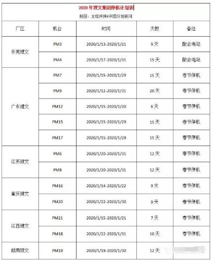 11月5日,理文造紙CEO李文斌簽發了2020年春節理文集團停機計劃表:從2020年1月12日起到1月31日止,在春節前后,理文國內外六大生產基地共有14臺紙機將錯時停機,停機時間在6-20天不等。