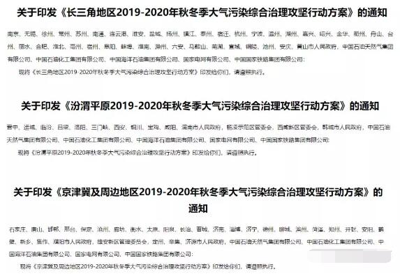 11月6日,生態(tài)環(huán)境部公布了兩份重要文件,一份是《長三角地區(qū)2019-2020年秋冬季大氣污染綜合治理攻堅行動方案》,一份是《汾渭平原2019-2020年秋冬季大氣污染綜合治理攻堅行動方案》。而在更早的10月11日,生態(tài)環(huán)境部還公布了一份《京津冀及周邊地區(qū)2019年-2020年秋冬季大氣污染綜合治理攻堅行動方案》。