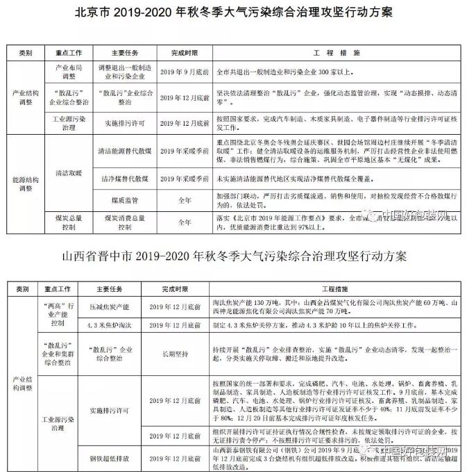 (三份文件標題) 三份方案均稱:受厄爾尼諾影響,2019-2020年秋冬季氣象條件整體偏差,不利于大氣污染物擴散,進一步加大了大氣污染治理壓力,必須以更大的力度、更實的措施抵消不利氣象條件帶來的負面影響。 據(jù)中國好包裝網(wǎng)統(tǒng)計,三份方案共涉及11個省級行政區(qū),包含的地級及以上城市在90個以上,要求在2019年10月1日至2020年3月31日期間,實施污染綜合治理攻堅行動! 一、主要目標 長三角地區(qū): 秋冬季期間(2019年10月1日-2020年3月31日),PM2.5平均濃度同比下降2%,重度及以上污染天數(shù)同比減少2%。 汾渭平原:秋冬季期間(2019年10月1日至2020年3月31日),PM2.5平均濃度同比下降3%,重度及以上污染天數(shù)同比減少3%。 京津冀及周邊地區(qū):秋冬季期間(2019年10月1日至2020年3月31日)PM2.5平均濃度同比下降4%,重度及以上污染天數(shù)同比減少6% 二、實施范圍 長三角地區(qū):上海市,江蘇省南京、無錫、徐州、常州、蘇州、南通、連云港、淮安、鹽城、揚州、鎮(zhèn)江、泰州、宿遷市,浙江省杭州、寧波、溫州、湖州、嘉興、紹興、金華、衢州、舟山、臺州、麗水市,安徽省合肥、淮北、亳州、宿州、阜陽、蚌埠、淮南、滁州、六安、馬鞍山、蕪湖、宣城、銅陵、池州、安慶、黃山市,共41個地級及以上城市。 汾渭平原:山西省晉中、運城、臨汾、呂梁市,河南省洛陽、三門峽市,陜西省西安、銅川、寶雞、咸陽、渭南市以及楊凌示范區(qū)(含陜西省西咸新區(qū)、韓城市)。 京津冀及周邊地區(qū):北京市,天津市,河北省石家莊、唐山、邯鄲、邢臺、保定、滄州、廊坊、衡水市以及雄安新區(qū),山西省太原、陽泉、長治、晉城市,山東省濟南、淄博、濟寧、德州、聊城、濱州、菏澤市,河南省鄭州、開封、安陽、鶴壁、新鄉(xiāng)、焦作、濮陽市(含河北省定州、辛集市,河南省濟源市)。 三、主要任務(wù) 三份《方案》所列的主要任務(wù)均有6個,分別是調(diào)整優(yōu)化產(chǎn)業(yè)結(jié)構(gòu)、加快調(diào)整能源結(jié)構(gòu)、積極調(diào)整運輸結(jié)構(gòu)、優(yōu)化調(diào)整用地結(jié)構(gòu)、有效應(yīng)對重污染天氣、有效應(yīng)對重污染天氣、加強基礎(chǔ)能力建設(shè)等。其中,與包裝印刷企業(yè)相關(guān)的主要集中于調(diào)整優(yōu)化產(chǎn)業(yè)結(jié)構(gòu)、加快調(diào)整能源結(jié)構(gòu)兩大任務(wù)。 中國好包裝網(wǎng)梳理過后發(fā)現(xiàn),關(guān)于調(diào)整產(chǎn)業(yè)結(jié)構(gòu)、調(diào)整能源結(jié)構(gòu)的任務(wù)又具體細分為11個,包裝印刷行業(yè)被重點點名!與包裝印刷行業(yè)相關(guān)的主要任務(wù)有: 長三角地區(qū): 1、2019年12月底前,市場監(jiān)管總局出臺低VOCs含量涂料產(chǎn)品技術(shù)要求。各地要大力推廣使用低VOCs含量涂料、油墨、膠粘劑,在技術(shù)成熟的家具、集裝箱、汽車制造、船舶制造、機械設(shè)備制造、汽修、印刷等行業(yè),推進企業(yè)全面實施源頭替代。各地應(yīng)將低VOCs含量產(chǎn)品優(yōu)先納入政府采購名錄,并在市政工程中率先推廣使用。 2、2019年12月底前,各地開展一輪VOCs執(zhí)法檢查,將有機溶劑使用量較大的,存在敞開式作業(yè)的,末端治理僅使用一次活性炭吸附、水或水溶液噴淋吸收、等離子、光催化、光氧化等技術(shù)的企業(yè)作為重點,對不能穩(wěn)定達到《揮發(fā)性有機物無組織排放控制標準》以及相關(guān)行業(yè)排放標準要求的,督促企業(yè)限期整改。 3、2019年12月底前,上海、江蘇行政區(qū)域內(nèi)和浙江、安徽城市建成區(qū)內(nèi)基本淘汰35蒸噸/小時以下燃煤鍋爐。鍋爐淘汰方式包括拆除取締、清潔能源替代、煙道或煙囪物理切斷等;基本完成65蒸噸/小時及以上燃煤鍋爐超低排放改造,達到燃煤電廠超低排放水平。 4、指導工業(yè)企業(yè)制定“一廠一策”實施方案,明確不同應(yīng)急等級條件下停產(chǎn)的生產(chǎn)線、工藝環(huán)節(jié)和各類減排措施的關(guān)鍵性指標,細化各減排工序責任人及聯(lián)系方式等。鼓勵各省(市)按要求在重污染天氣應(yīng)急管理平臺上填報應(yīng)急減排清單,實現(xiàn)清單電子化管理。 汾渭平原: 1、大力推廣使用低VOCs含量涂料、油墨、膠粘劑,在技術(shù)成熟的家具、整車生產(chǎn)、機械設(shè)備制造、汽修、印刷等行業(yè),推進企業(yè)全面實施源頭替代。各地應(yīng)將低VOCs含量產(chǎn)品優(yōu)先納入政府采購名錄,并在各類市政工程中率先推廣使用。 2、2019年12月底前,各地開展一輪VOCs執(zhí)法檢查,將有機溶劑使用量較大的,存在敞開式作業(yè)的,末端治理僅使用一次活性炭吸附、水或水溶液噴淋吸收、等離子、光催化、光氧化等技術(shù)的企業(yè)作為重點,對不能穩(wěn)定達到《揮發(fā)性有機物無組織排放控制標準》以及相關(guān)行業(yè)排放標準要求的,督促企業(yè)限期整改。 3、2019年12月底前全部淘汰每小時10蒸噸及以下燃煤鍋爐,城市建成區(qū)基本淘汰每小時35蒸噸以下燃煤鍋爐。鍋爐淘汰方式包括拆除取締、清潔能源替代、煙道或煙囪物理切斷等。2019年12月底前,各地基本完成每小時65蒸噸及以上燃煤鍋爐超低排放改造,達到燃煤電廠超低排放水平。 4、指導工業(yè)企業(yè)制定“一廠一策”實施方案,明確不同應(yīng)急等