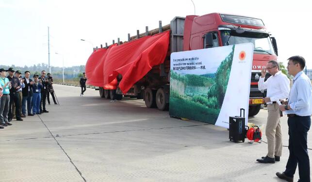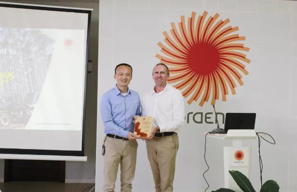 北海工廠總經(jīng)理朱偉言(左)向林業(yè)總經(jīng)理勃朗登贈(zèng)送紀(jì)念牌 2019年11月13日,斯道拉恩索廣西林業(yè)向北海工廠交付第100萬方機(jī)械采伐木材原材料慶祝儀式在鐵山港舉行。斯道拉恩索重要的合資伙伴廣西林業(yè)集團(tuán)、北海林業(yè)投資有限公司的代表,及來自斯道拉恩索林業(yè)運(yùn)營周邊鄉(xiāng)鎮(zhèn)政府代表們共同見證了這一重要時(shí)刻。